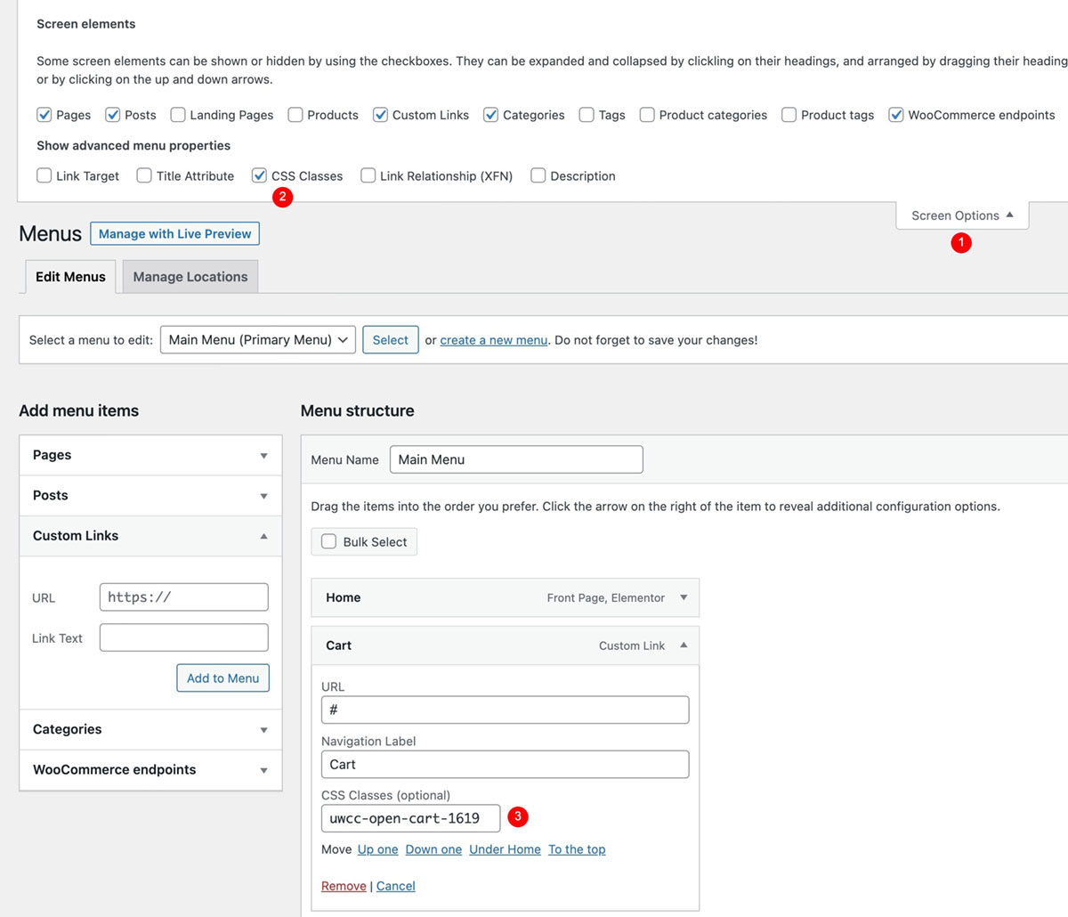 Step 2: Click on the Screen Options at the top of the screen and check the “CSS Classes” Option. You can additionally add the icon if your theme supports the icon on the menu.