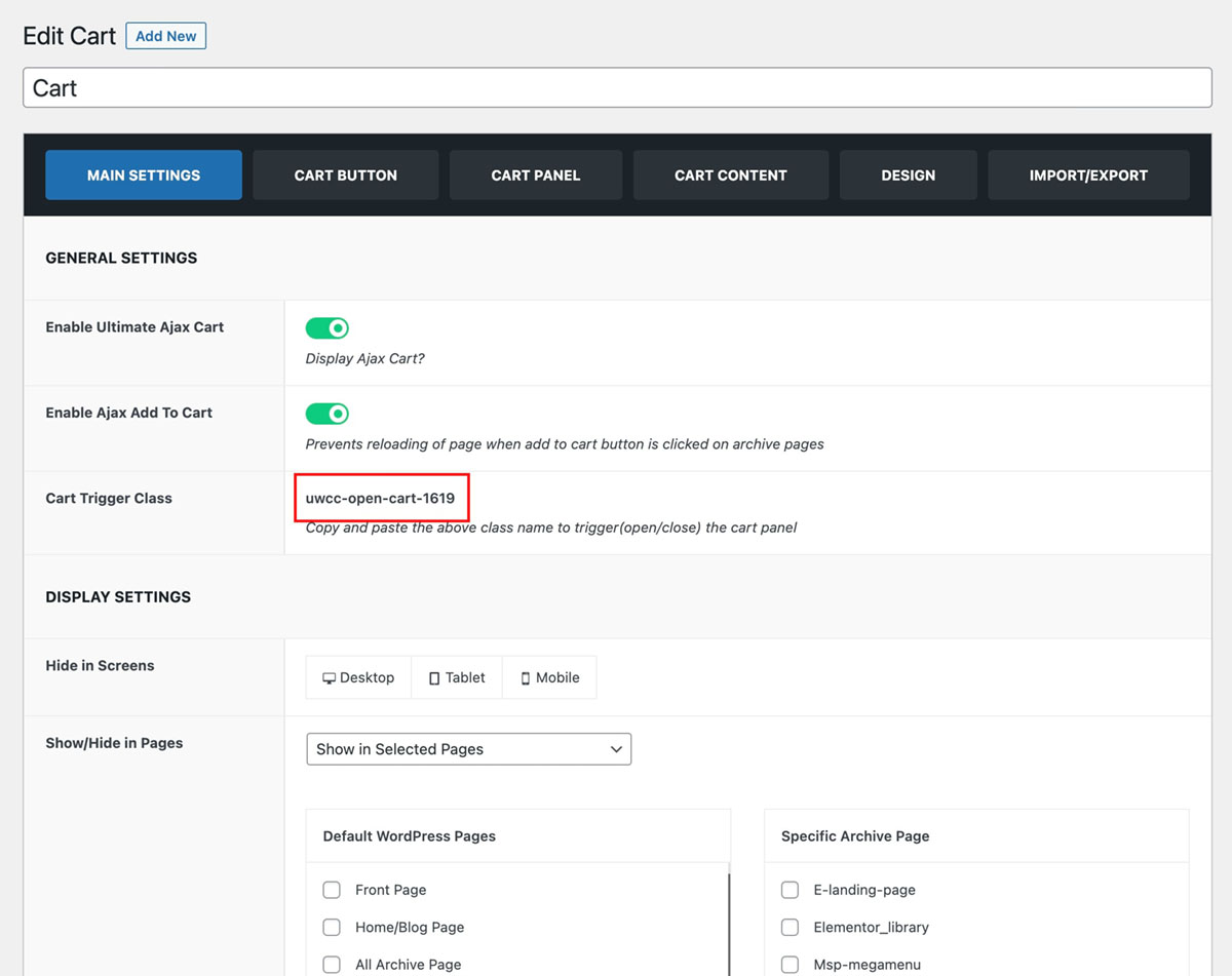 Step 2: On the “Main Settings” Tab, copy the “Cart Trigger Class” indicated by a red box in the below screenshot