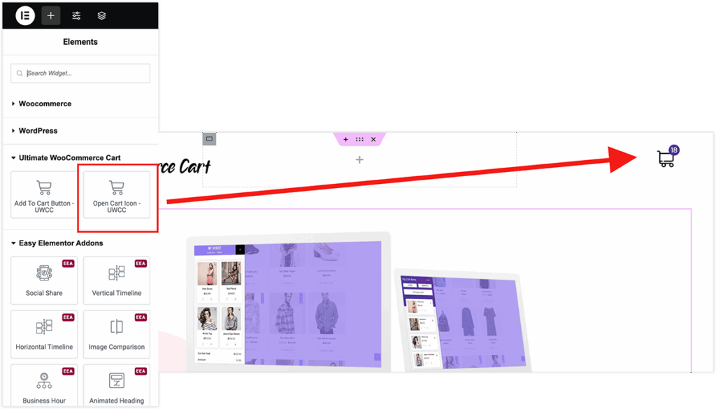 If you’re using Elementor, you can easily display a cart icon by using the “Open Cart Icon – UWCC” widget, available under the Ultimate WooCommerce Cart Header section.